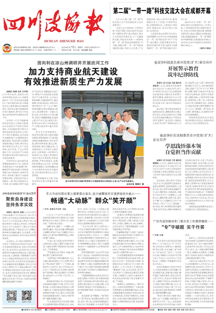 2025年6月12日,《四川政协报》头版刊登乐山市政协宣传稿件《乐山市政协强化重点提案督办落实,助力破解城市交通拥堵民生痛点——畅通“大动脉” 群众“笑开颜”》。