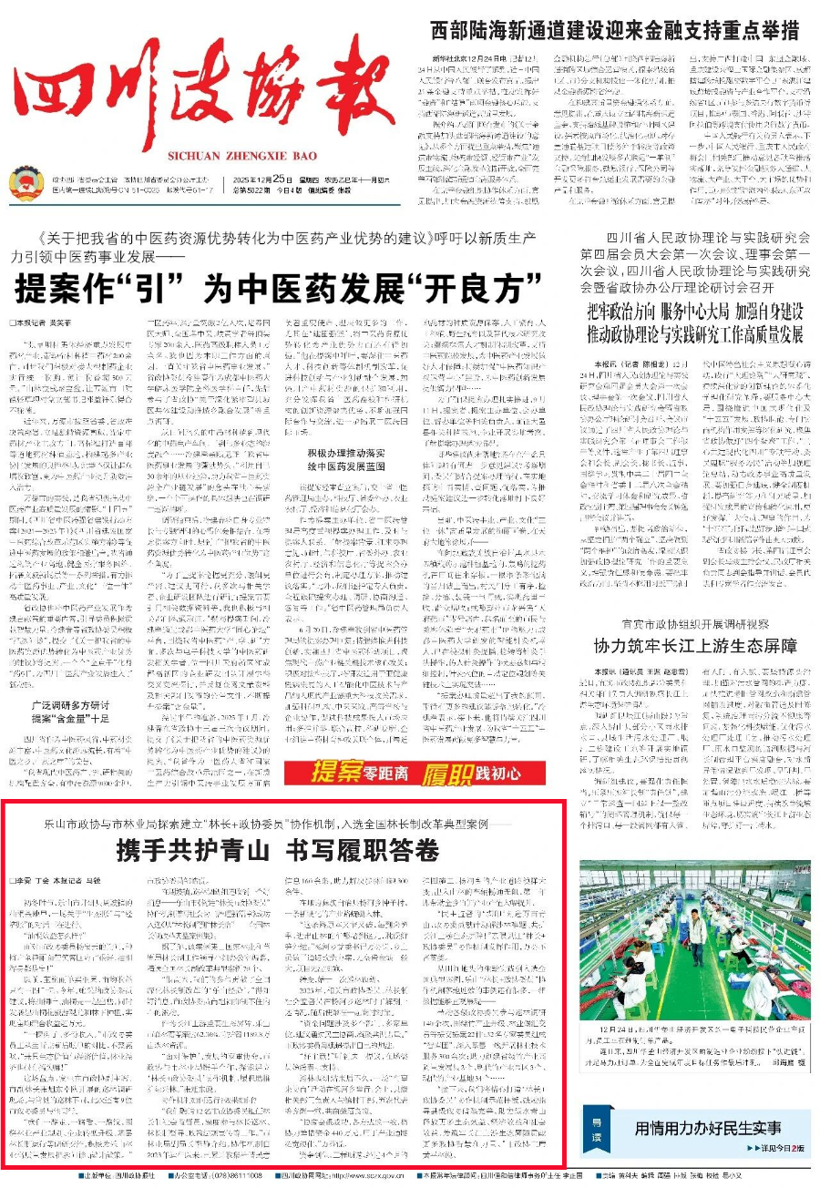 2025年12月25日,《四川政协报》头版刊登乐山市政协宣传稿件《乐山市政协与市林业局探索建立“林长+政协委员”协作机制,入选全国林长制改革典型案例——携手共护青山 书写履职答卷》。