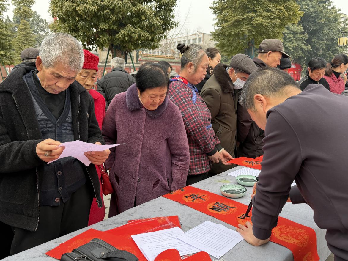 活动现场,大红宣纸铺展,笔墨书香萦绕。书画家们挥毫泼墨,楷书端庄、行书飘逸,一幅幅春联跃然纸上,承载着对群众的美好期许和对县域文化传承的深切关注。村民们围聚围观、争相领取,手中捧着红彤彤的春联,脸上满是喜悦。