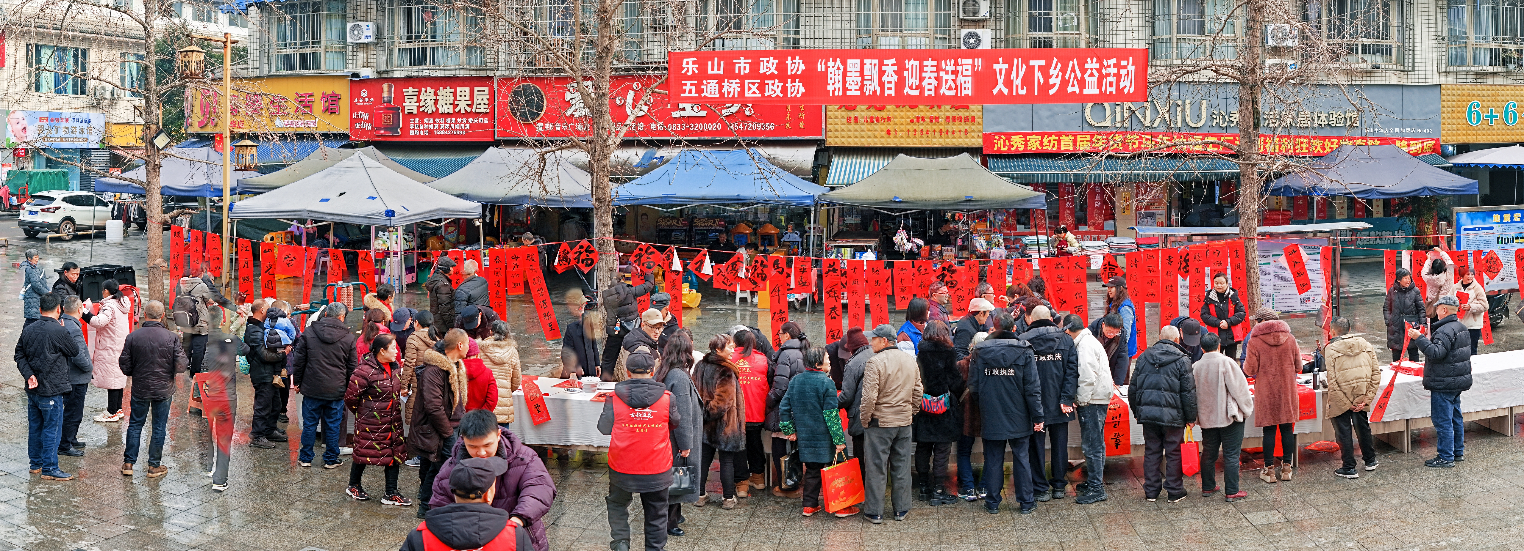 本次活动分别在高新区市民广场、五通桥区牛华镇举行。活动当天,闻讯而来的村民们早早便在书画桌前排起了长队,翘首以待。书画家们甫一就位,便铺纸研墨、凝神运笔。随着笔锋流转,一副副寓意吉祥的春联、一个个饱满圆润的“福”字跃然纸上,依次递到乡亲们手中。一时间,现场墨香四溢,暖意融融。红纸黑字间,飘散着节日的喜庆,流淌着传统文化的温度,更传递着政协服务为民的深厚情谊。